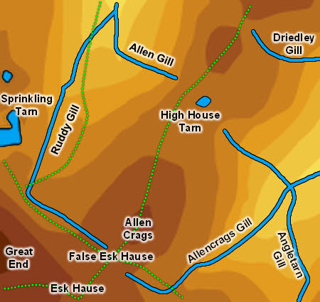 Allen Crags is bordered by Ruddy Gill to the south-west and west - the gill rises just below the false Esk Hause, runs west for a short distance then turns north to run down into Borrowdale.