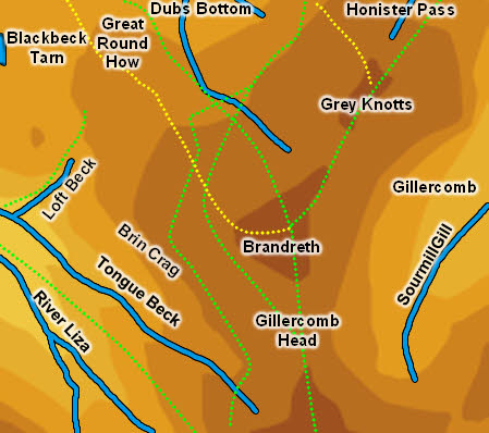 Brandreth can be reached from Ennerdale either by the path alongside Loft Beck or by the path up Tongue (between Tongue Beck and the River Liza), which joins Moses Trod in Stone Cove. A good path runs from the Honister-Haystacks path, passing to the right of Great Round How (ignore the marked right of way, which isn't clear on the ground).