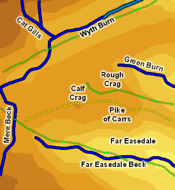 Far Easedale Beck forms the southern boundary of the fell, running past its south face. The western boundary is formed by Mere Beck, which rises on High Raise and flows south past the western end of Calf Crag. This flows into Wyth Burn, which forms the northern boundary.
