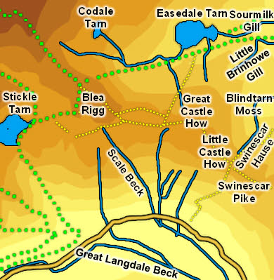 In the north Swinescar Hause flows into Blindtarn Moss, forming the eastern boundary of the fell. An unnamed beck forms the western boundary, running into Easedale Tarn. Between the two is Little Brinhowe Gill, which runs down into to Easedale, only joining Sourmilk Gill after the waterfalls.