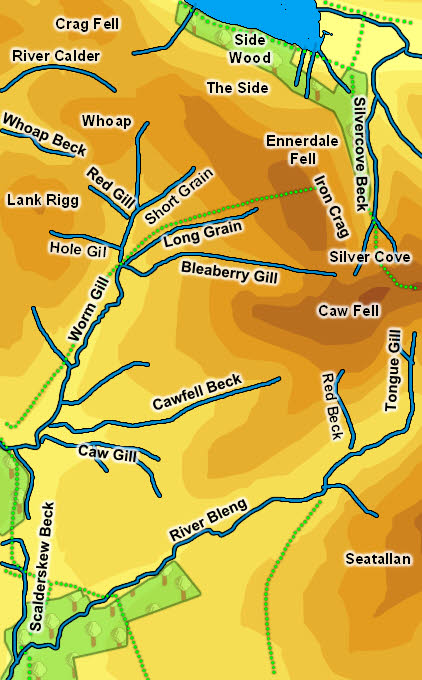 Bleaberry Gill forms the north-western boundary, flowing west between Caw Fell and Iron Crag, before joining Worm Gill. Worm Gill flows south/ south west, and forms part of the western boundary of the fell. Caw Fell ends in this direction where Worm Gill turns west to run beween Swainson Knott and Lank Rigg.