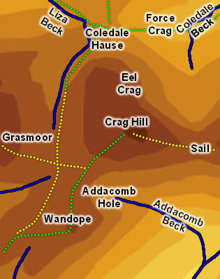 The southern boundary is formed by Addacomb Beck, which rises in Addacomb Hole, a fine example of a hanging valley. To the north-east the upper reaches of Coledale Beck flow below the crags before flowing past (but not over) Force Crag. No beck flows east from Coledale Hause.