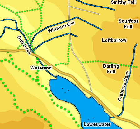 The northern boundary of the fell could be taken at Loftbarrow or at Sourfoot Fell. If we use Loftbarrow then the north-western boundary is formed by Whittern Gill, which flows west then flows into Dub Beck and turns east to run into Loweswater. If we use Sourfoot Fell then Mosser Beck is the boundary, flowing north-west then north-east into the River Cocker, while the western boundary is lost in undulating countryside.