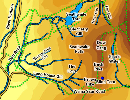 Dow Crag has a share in two tarns and can climb a third entirely for itself. Goat's Water is the tarn most often associated with the fell, and sits in a splendid location below the eastern crags. To the north-west is Seathwaite Tarn, a reservoir that sits in a steep valley between Dow Crag and Grey Friar. Finally comes Blind Tarn, a small tarn that sits below the cliffs at the southern end of the ridge (east of Brown Pike), and that is very difficult to spot apart from from directly above. The name refers to the lack of an outflow, as no beck flows out of the the tarn.
