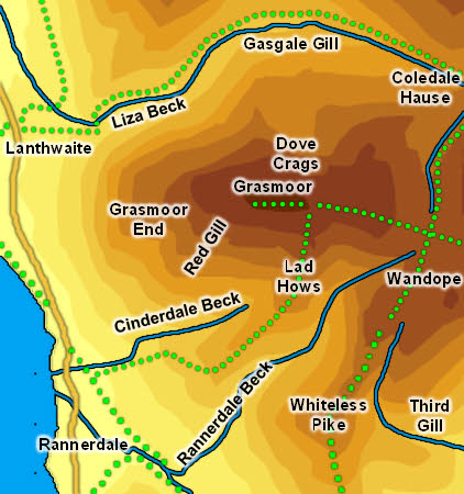 In the west is a nameless and rather minor stream that runs south from Lanthwaite Gate into Crummock Water, and forms the boundary between Grasmoor and Brackenthwaite Hows.