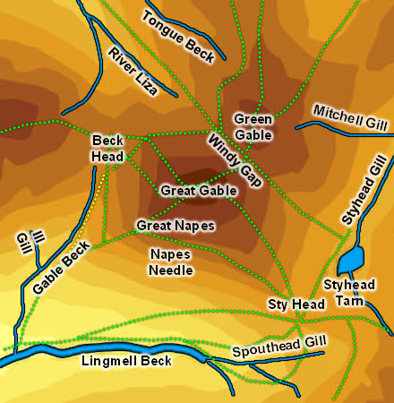 Most of Great Gable's slopes are dry, but the boundaries are all marked by water. To the north east the River Liza flows north-west into Ennerdale while a beck flows down Aeron Slack towards Styhead tarn.