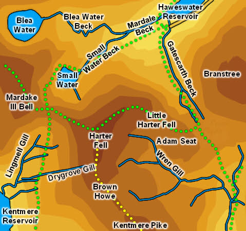 To the north Harter Fell is bordered by Small Water Beck, which flows out of Small Water and heads towards Haweswater. Before reaching the lake it merges with Blea Water Beck and becomes Mardale Beck.
