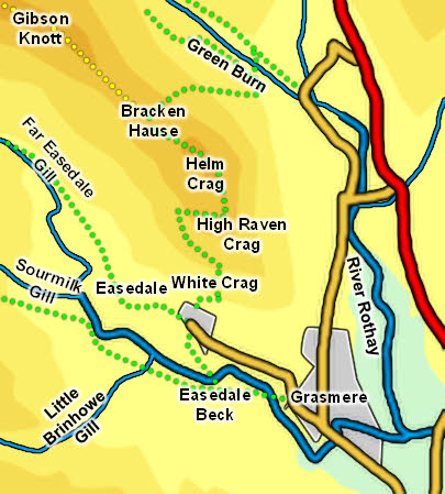 Helm Crag is at the end of a ridge, with no real water courses making the end of this fell and the start of Gibson Knott. It is surrounded on three sides by streams - Green Burn in the north and Easedale Beck in the south both flow into the River Rothay, which forms the eastern boundary.