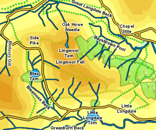Lingmoor Fell can be climbed from the Elterwater end, from Little Langdale hamlet or from the Blea Tarn end.