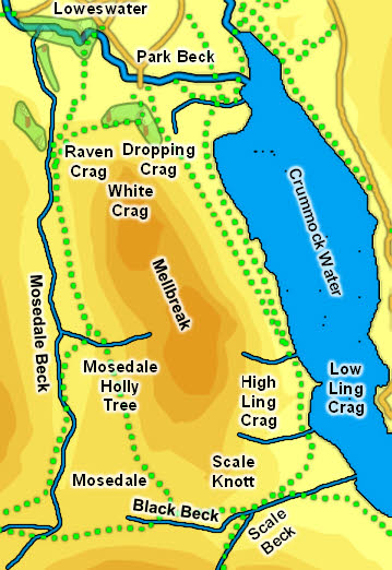Mellbreak doesn't give birth to any named streams, although a number of watercourses do form on the steep west and eastern slopes (more after heavy rain).