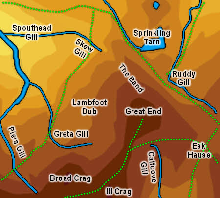 Sprinkling Tarn drains north-west down a steep stream in something of a ravine, just below the path from Sty Head. This stream is often regarded as the source of the River Derwent