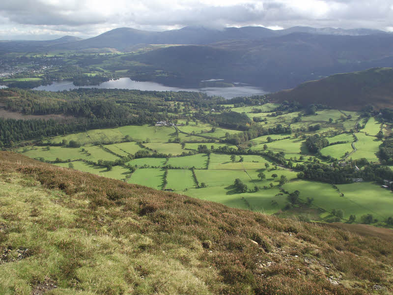 A view of the lower Newlands Valley from Barrow, looking across the mouth of the valley towards Derwent Water and Keswick.