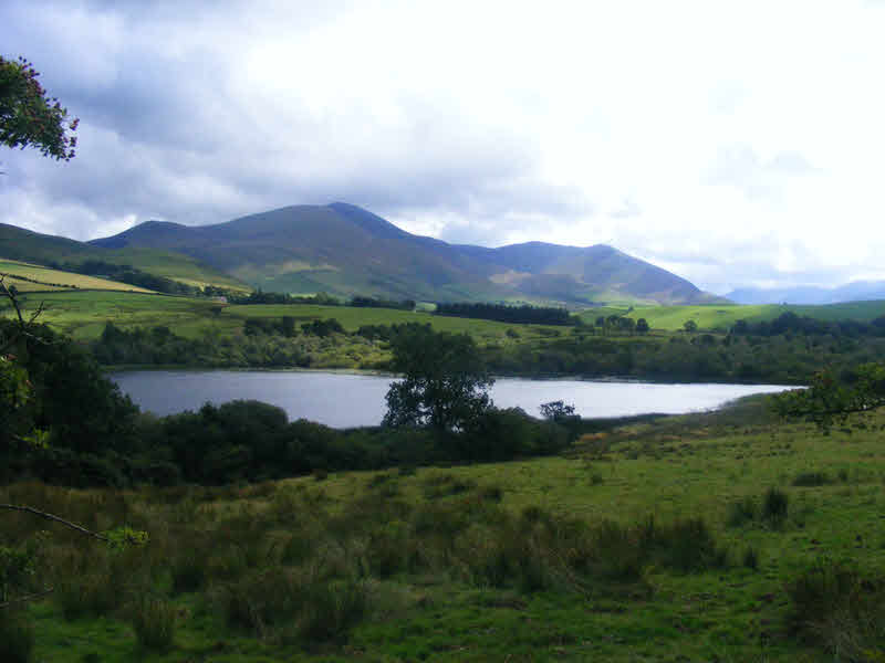 Over Water seen from the nearby road, the closest it is possible to get. In the background is the Skiddaw range with the Ullock Pike ridge on the right.
